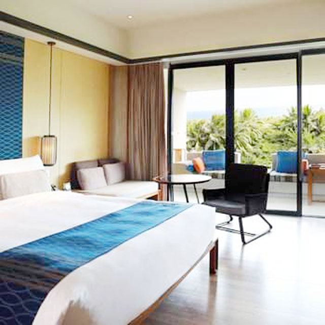 酒店坐北朝南,占地13万平方米,由两种风格完全不同的建筑构成。东侧的水景区占地约5万平方米,高3层的现代花园式环保建筑及24栋别墅。水景区每间客房均在80平方米以上,包含16平方米的独立观景阳台。远眺椰林,近观花园水景,让您尽可能的融入大自然。酒店西侧的天阁楼高11层,60平米的客房面积内含一个10平方米的阳台,让您从绝佳的视角俯瞰小东海全景,是您不容错过的打卡点。